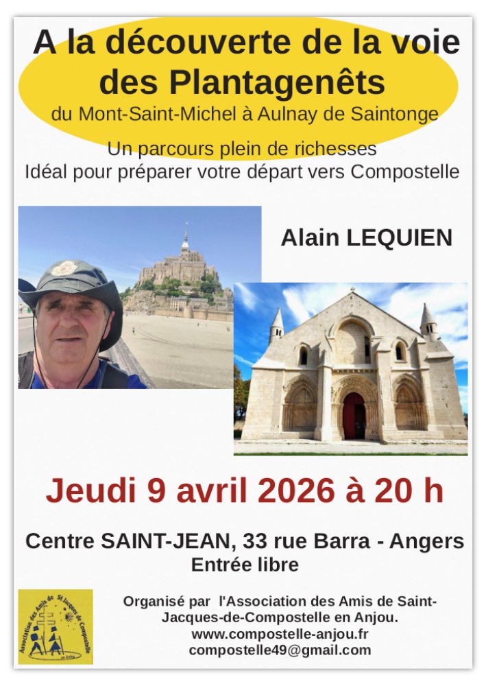 Vous trouverez sur le site des Amis de Compostelle en Anjou des conseils, des informations sur nos activités : depuis une dizaine d’années, la voie des Plantagenêts est balisée pour permettre la traversée du département de Maine-et-Loire, soit vers Compostelle (via la Voie de Tours) soit vers le Mont Saint-Michel.